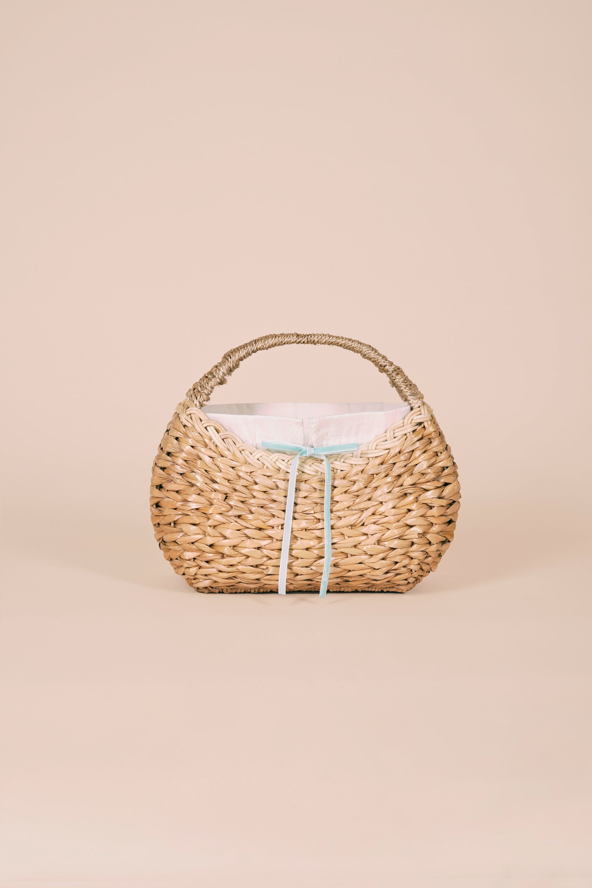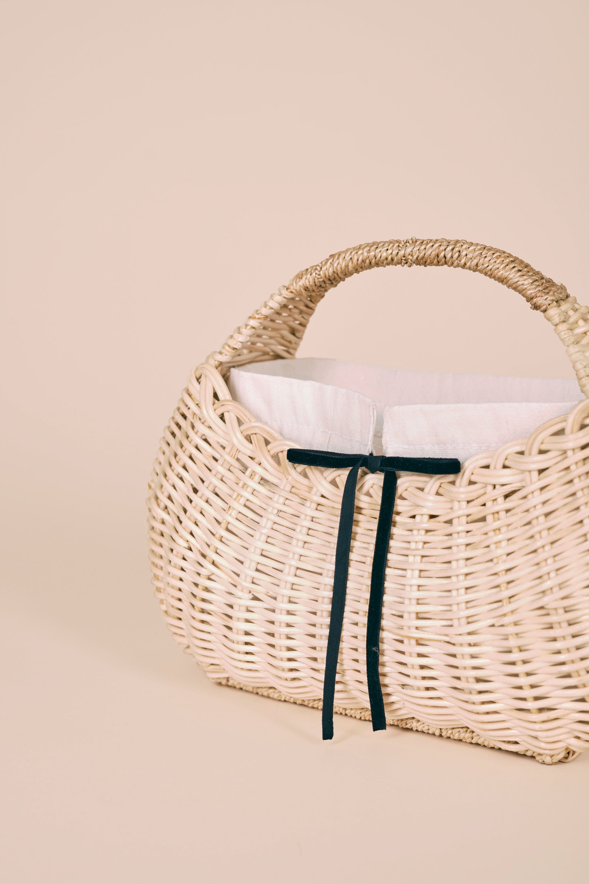 She features a removable canvas lining with a black drawstring closure, secured with a bow tied at the front. Personalize her with our interchangeable ribbon set, available in four signature shades: wine red, blush pink, baby blue, and deep blue.