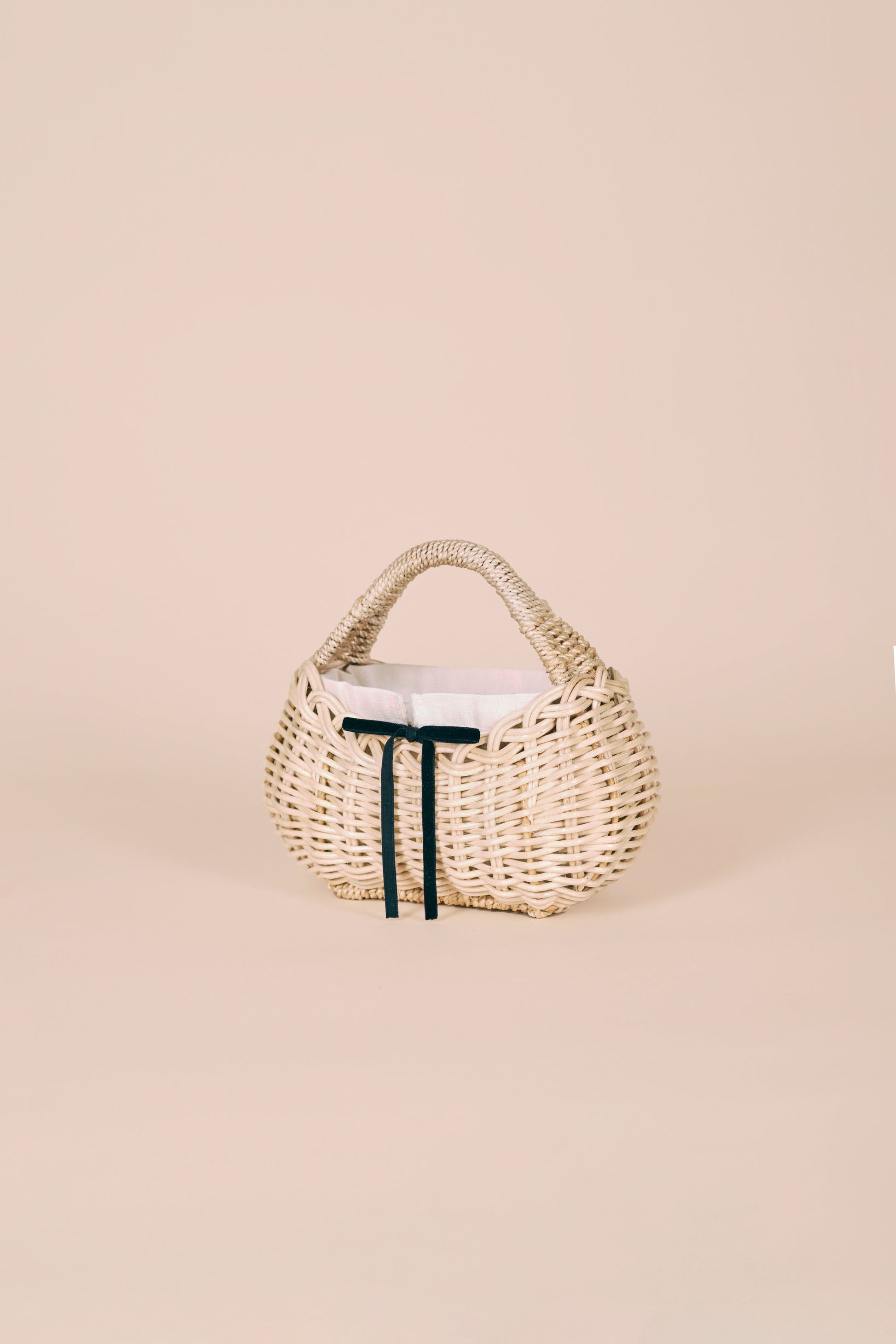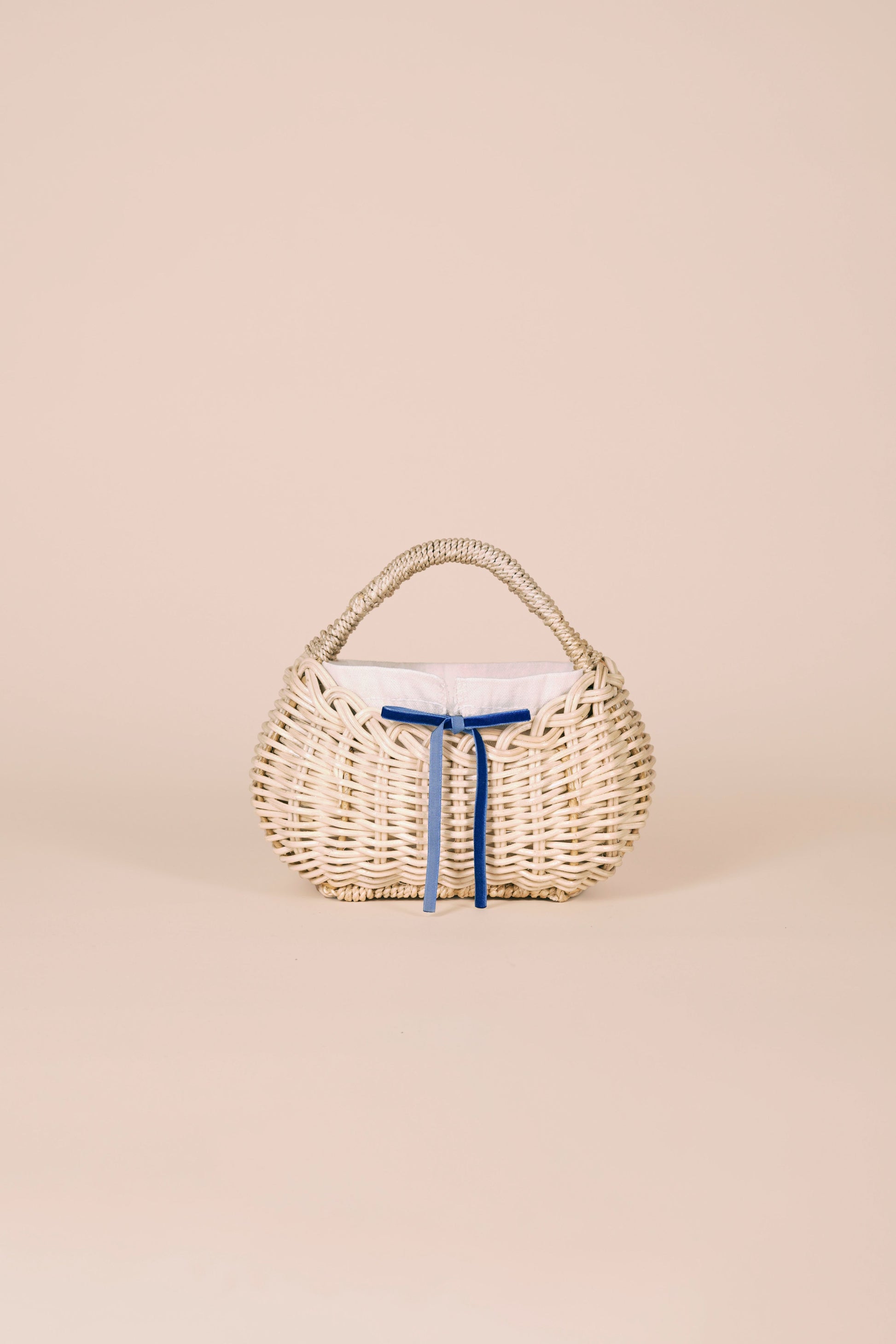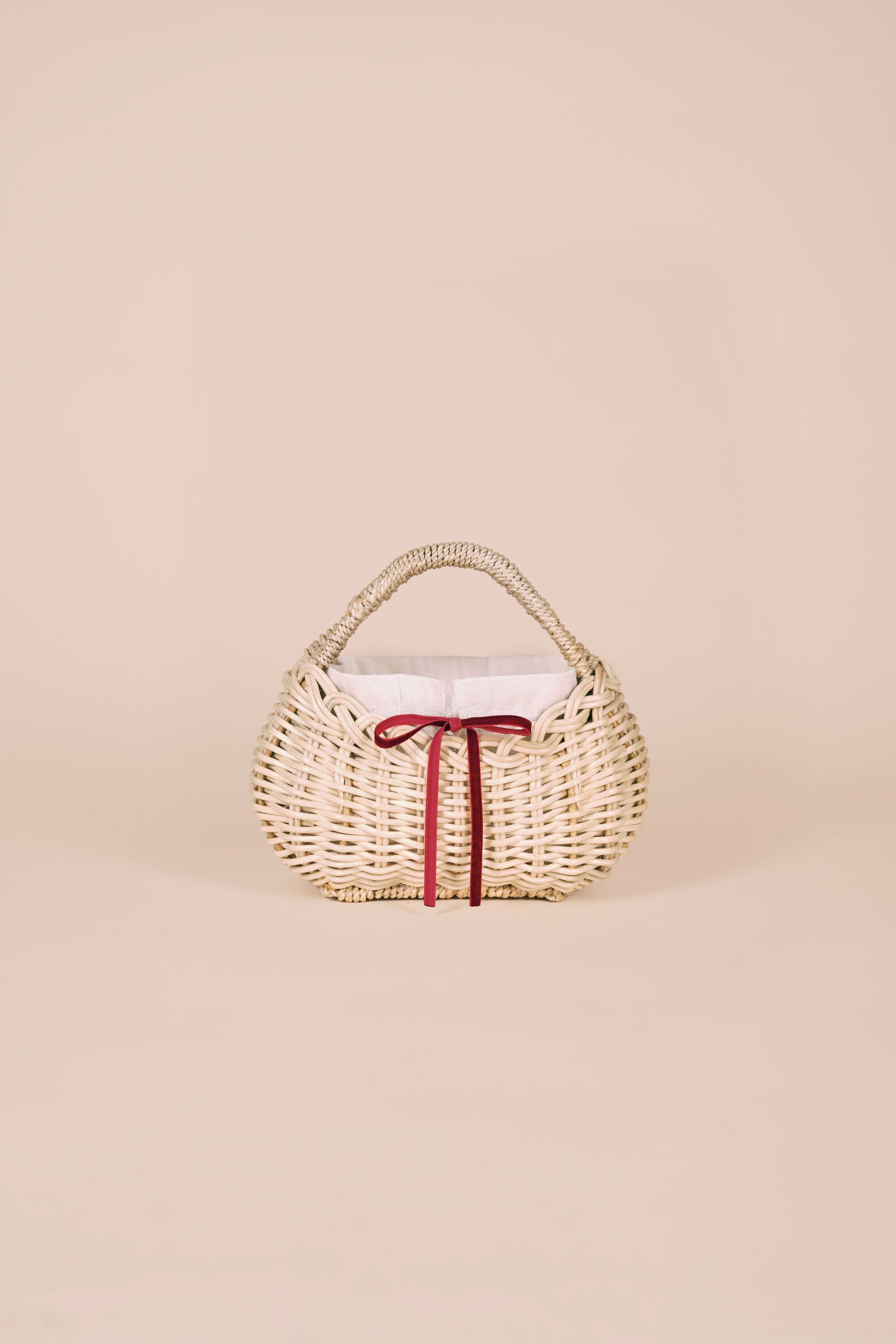 She features a removable canvas lining with a black drawstring closure, secured with a bow tied at the front. Personalize her with our interchangeable ribbon set, available in four signature shades: wine red, blush pink, baby blue, and deep blue.