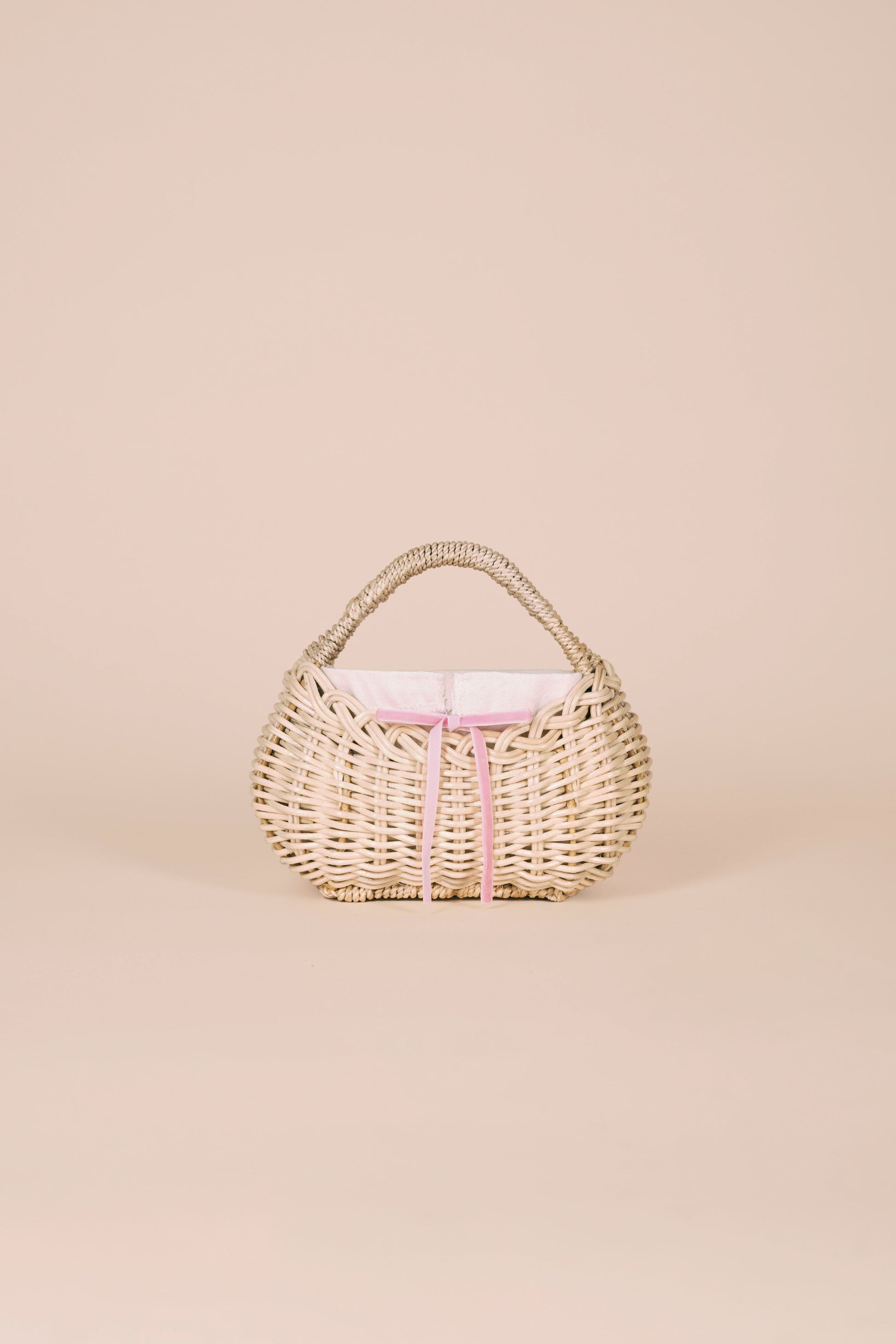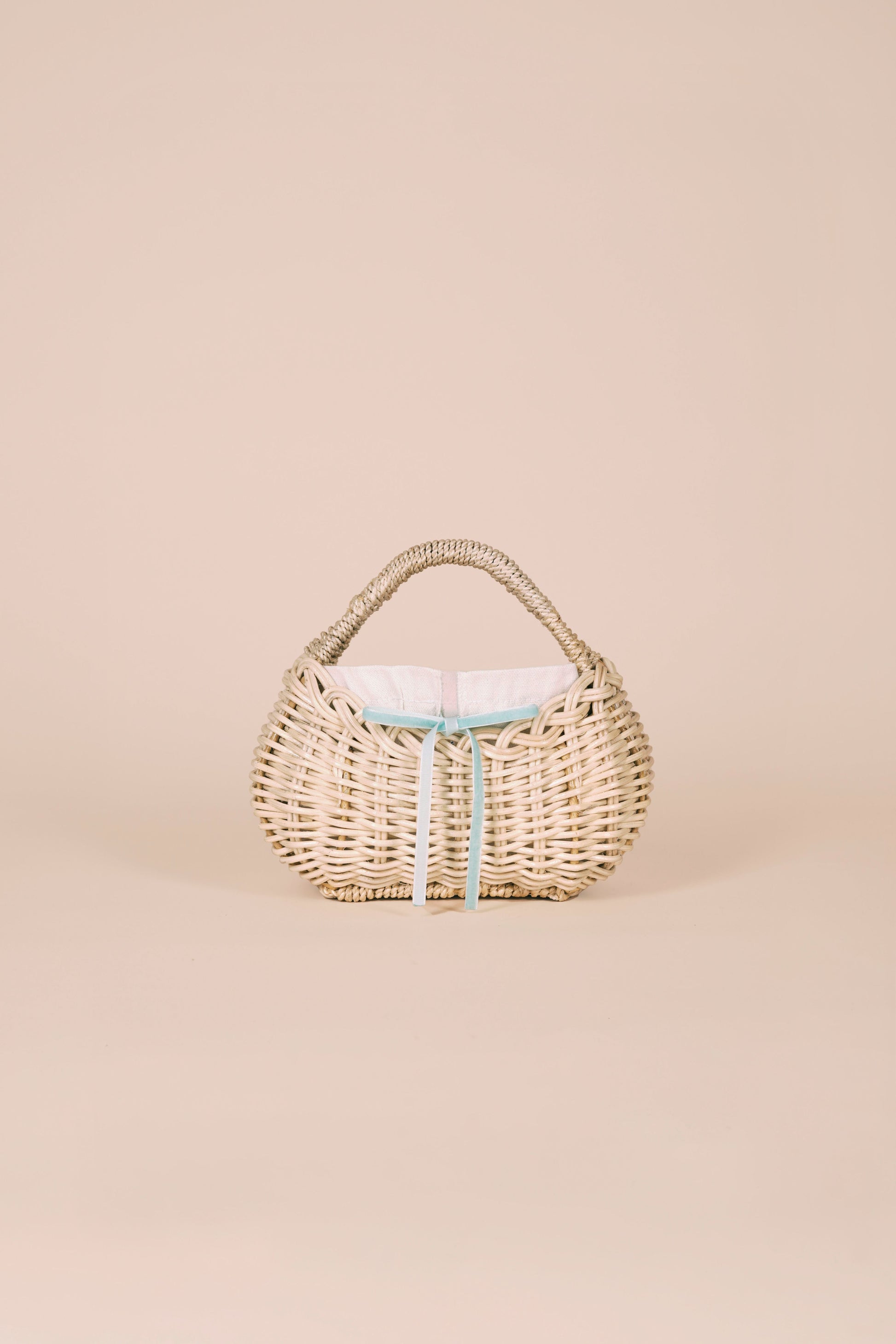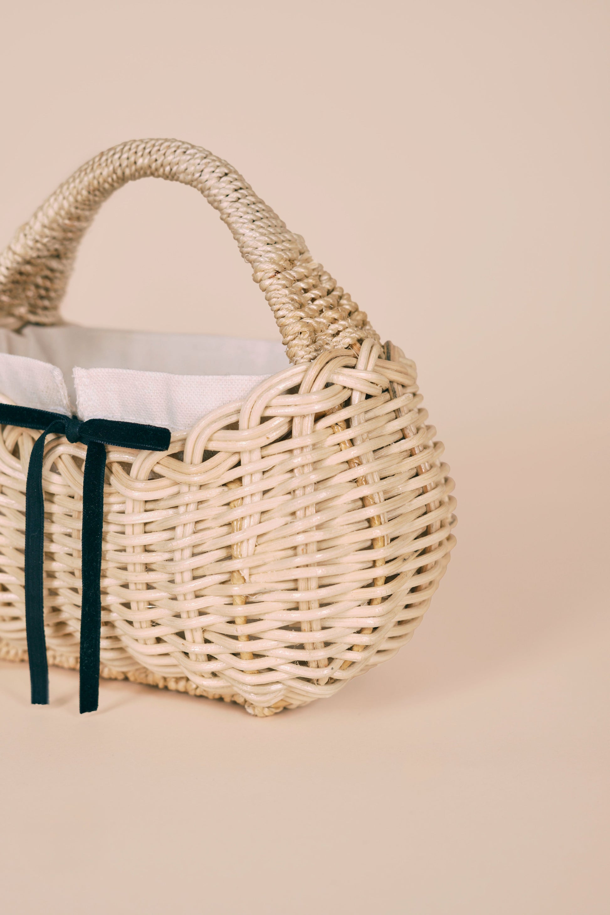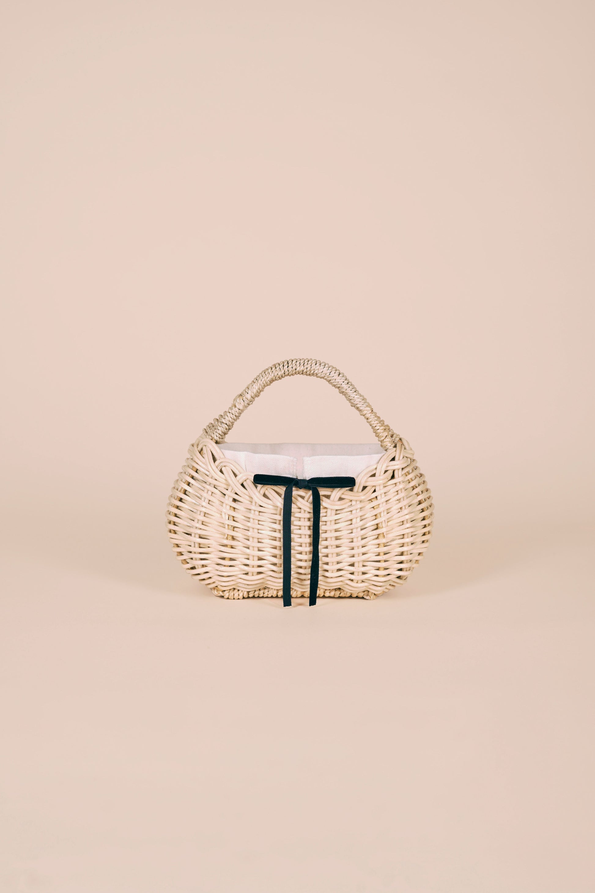 She features a removable canvas lining with a black drawstring closure, secured with a bow tied at the front. Personalize her with our interchangeable ribbon set, available in four signature shades: wine red, blush pink, baby blue, and deep blue.
